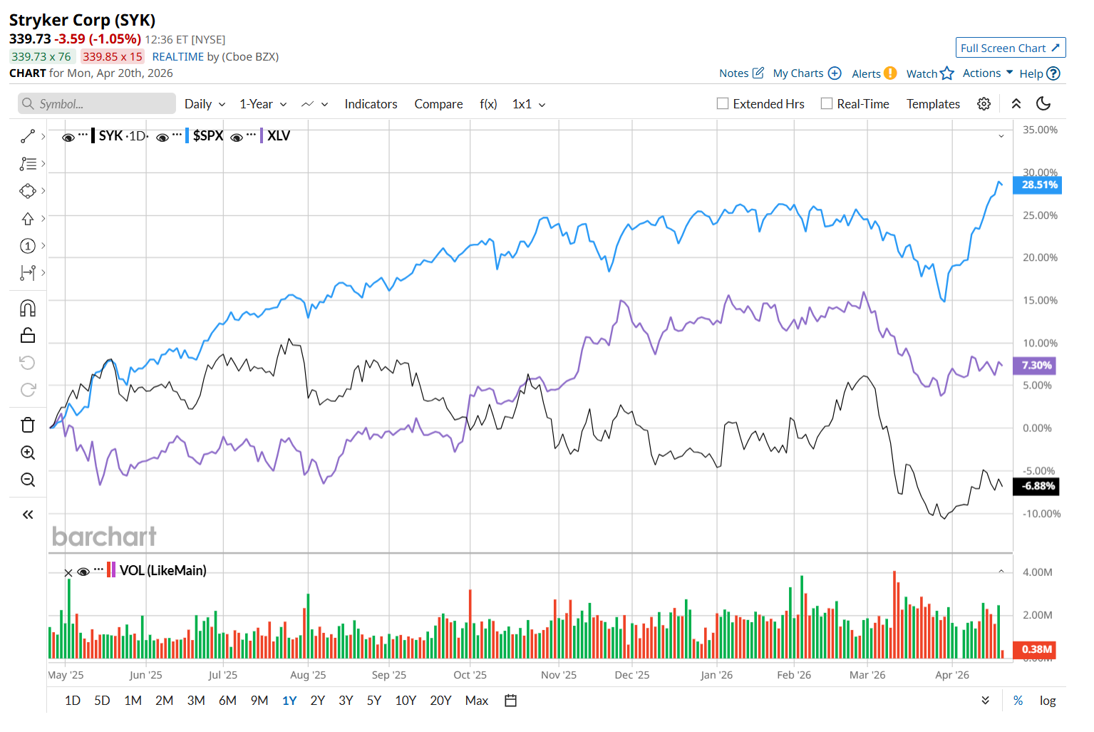 SYK has declined 1.7% over the past 52 weeks, considerably underperforming both the S&P 500 Index's ($SPX) 34.9% return and the State Street Health Care Select Sector SPDR ETF’s (XLV) 9.8% uptick over the same time period.