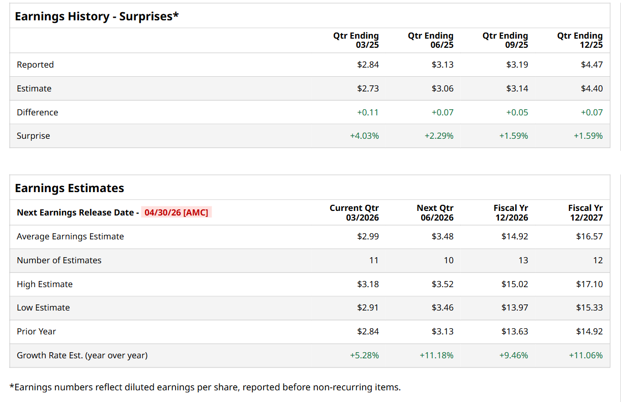 Valued at a market cap of $131.5 billion, Stryker Corporation (SYK) is a medical technology company that is widely recognized for its market-leading Mako robotic-arm assisted surgery platform and a diverse portfolio that includes joint replacement implants, surgical equipment, and neurovascular intervention tools. The Portage, Michigan-based company is expected to announce its fiscal Q1 earnings for 2026 after the market closes on Thursday, Apr. 30.